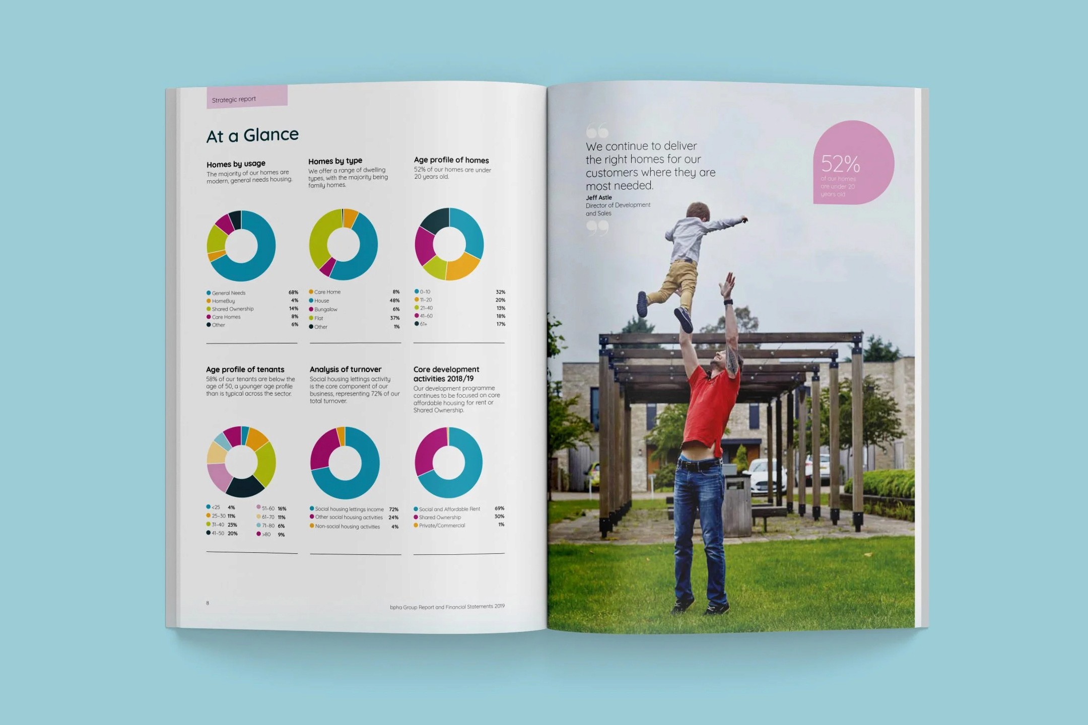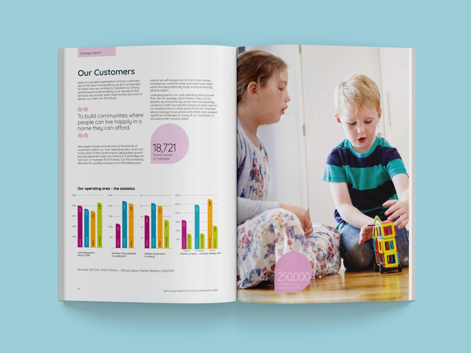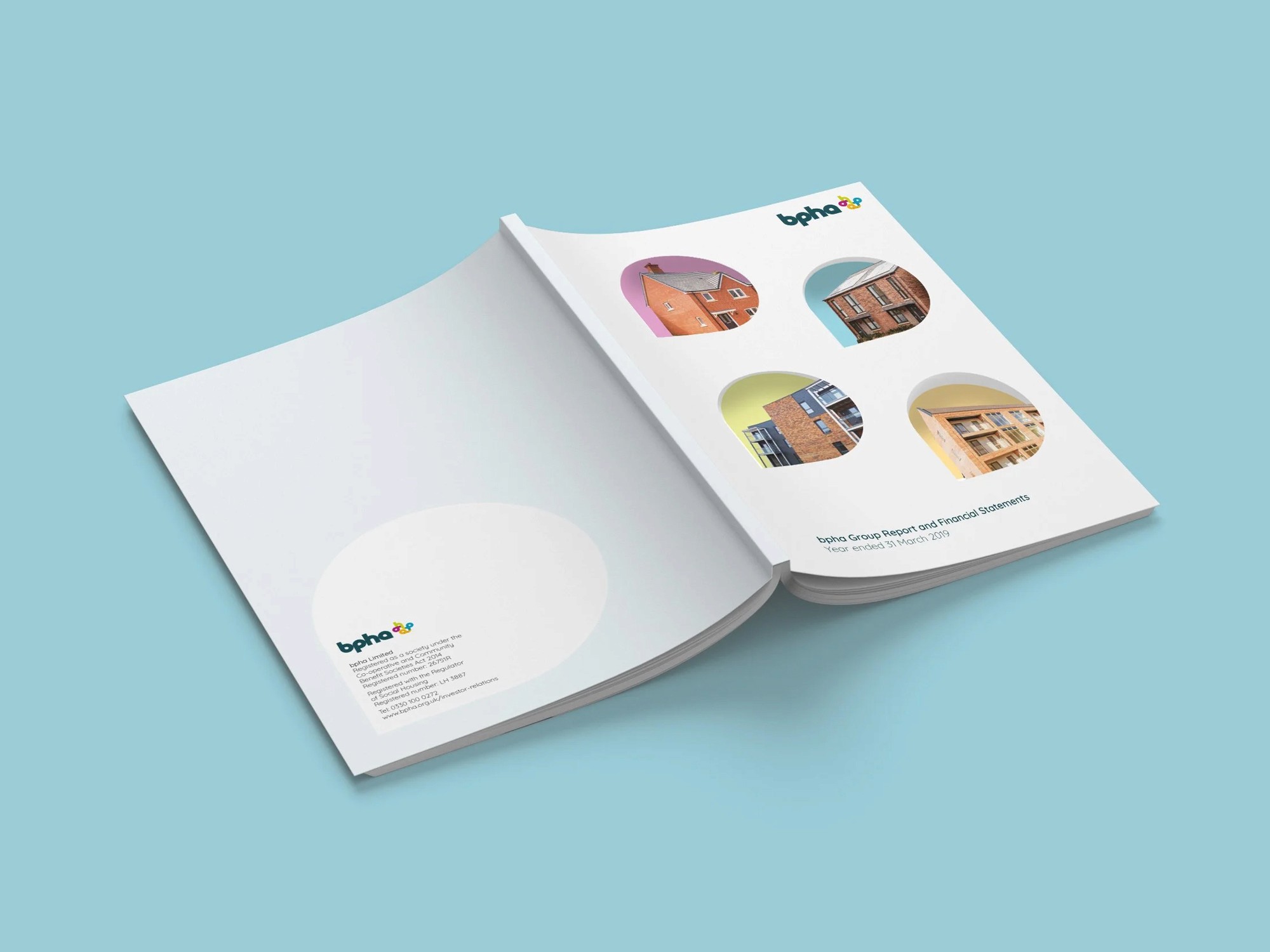 I helped design bpha's Group Report and Financial Statements 2018-2019 while working at Navig8, delivering a professional, resident-focused document featuring a unique die-cut cover relealing the real people living in the homes that they were placed behind. Paired with a clean interior layout that balanced financial data with human stories.