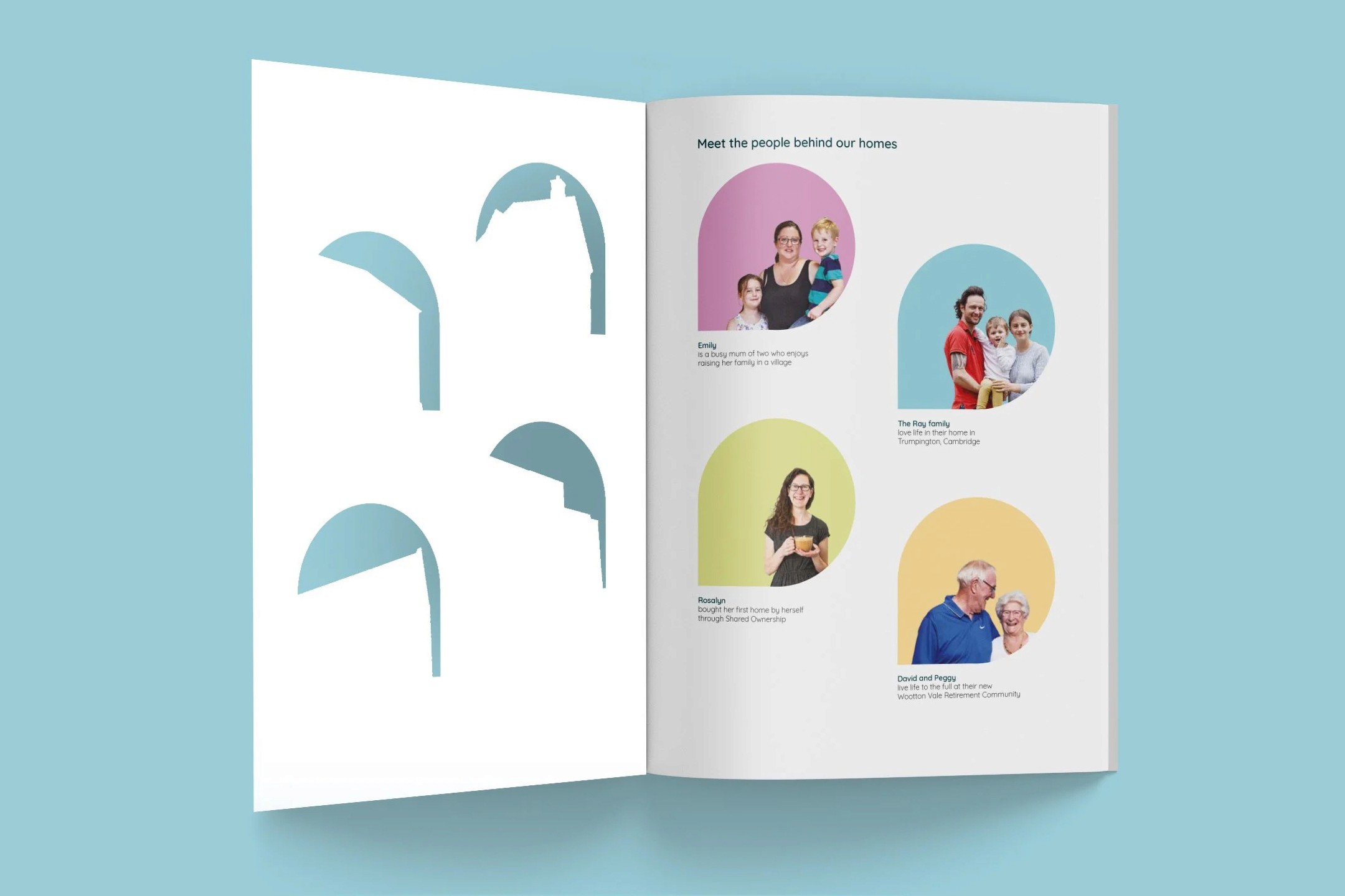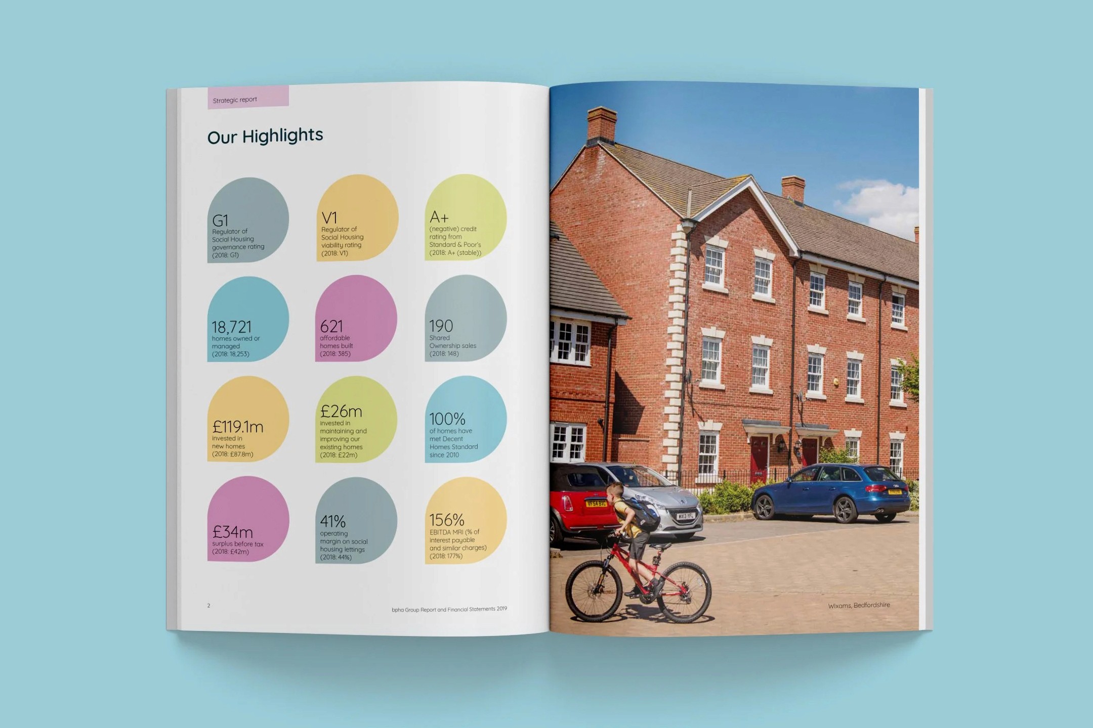 As a housing association, bpha's annual financial report needed to present solid numbers. Operating margins, cash flows, investments, debt. All in a trustworthy way, but the bigger challenge was avoiding the typical dry, corporate feel. We wanted it to reflect the organisation's mission of providing homes and support to real people, so the design had to integrate genuine resident stories and faces. The standout idea was a die-cut cover that literally revealed the people behind the houses, turning an abstract financial document into something personal and meaningful.