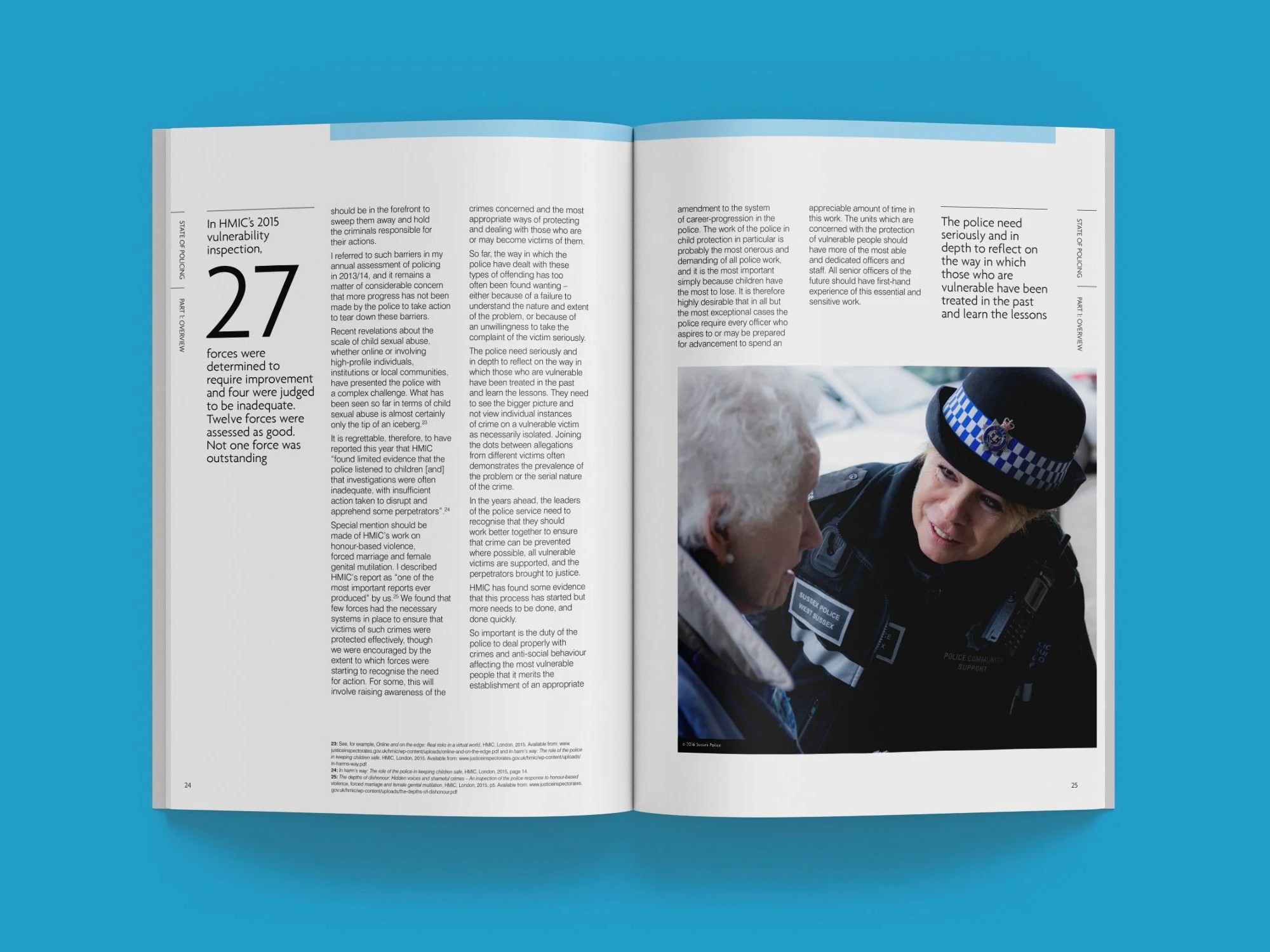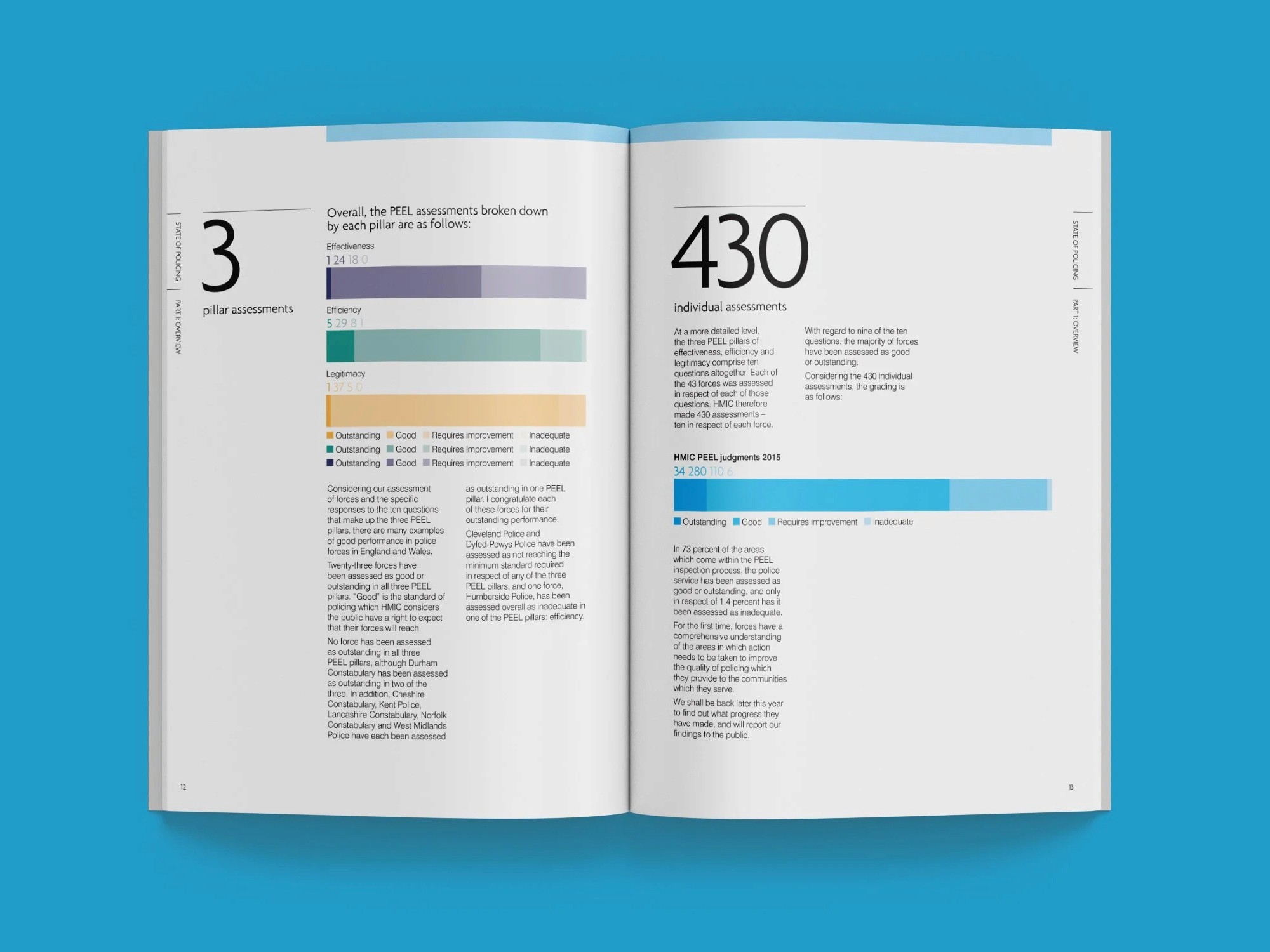 The State of Policing report is HMIC's flagship publication. It's a detailed assessment of forces' performance, risks, and progress. The challenge was to design a document that conveyed impartiality and gravitas while making complicated findings (statistics, inspections, thematic analysis) easy to navigate and understand. We needed to handle a substantial page count with multiple sections, charts, tables, and case studies without overwhelming the reader, all while adhering to strict public-sector standards for professionalism, accessibility, and print quality.