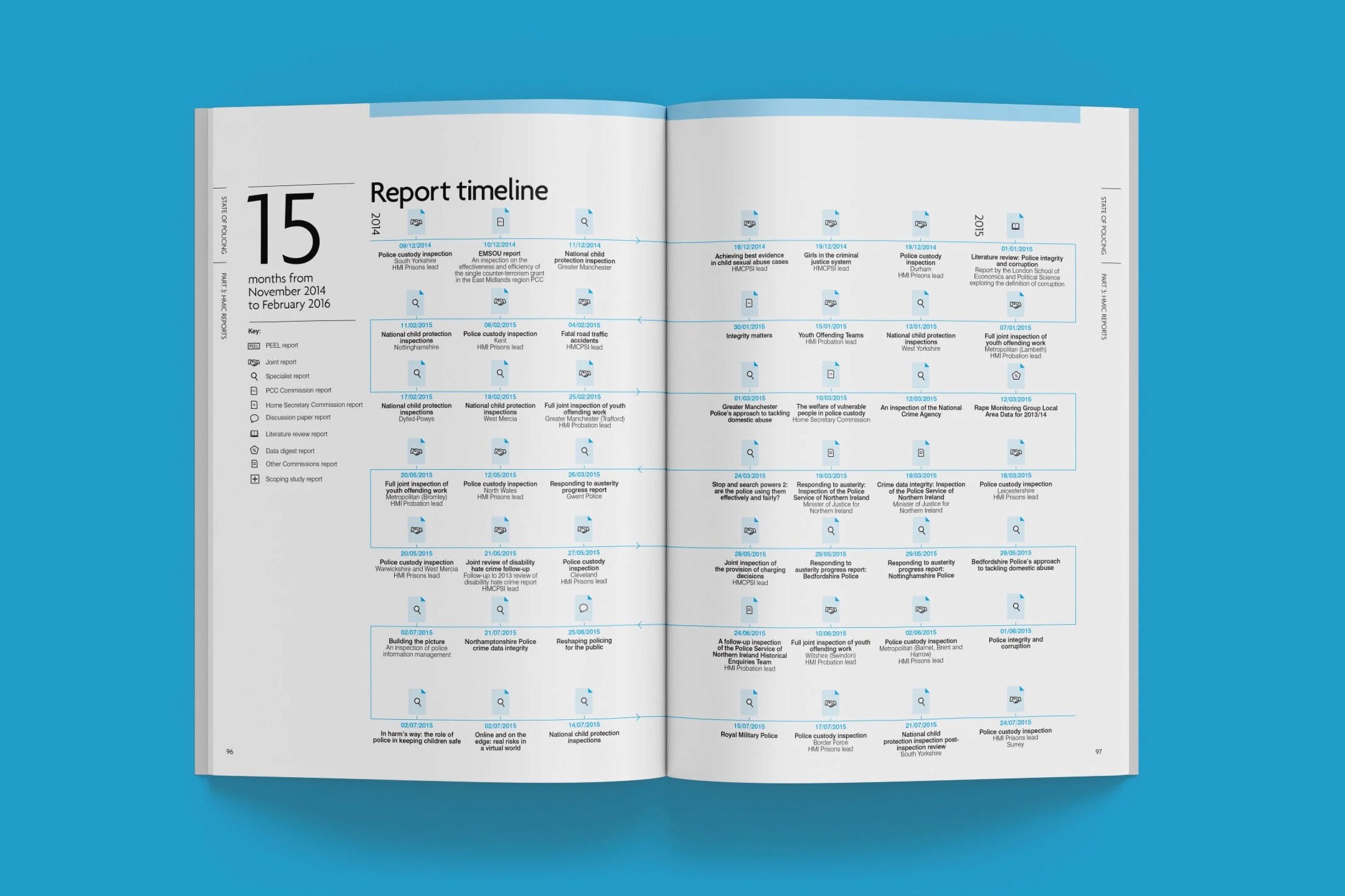 I helped design the State of Policing 2015 report for HMIC whilst working at Navig8. Contributing to a clean, authoritative layout that presented complex policing data and insights in a professional, readable format. With strong typography, clear data visualizations, and a serious yet accessible public-sector aesthetic.