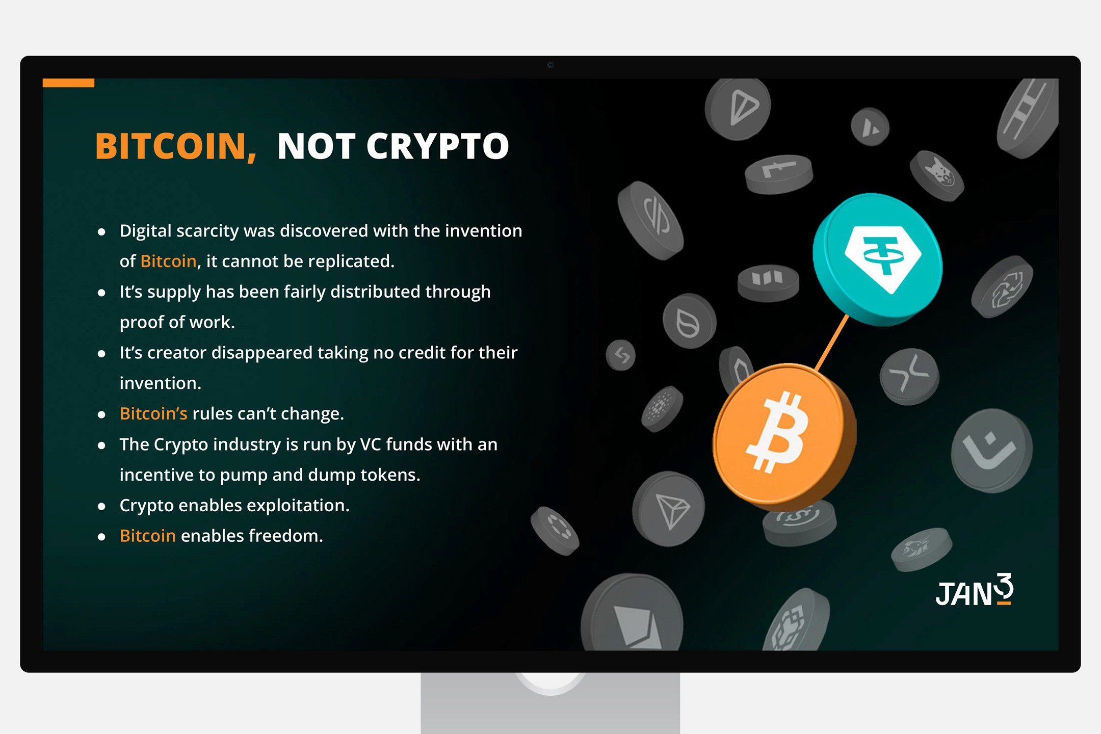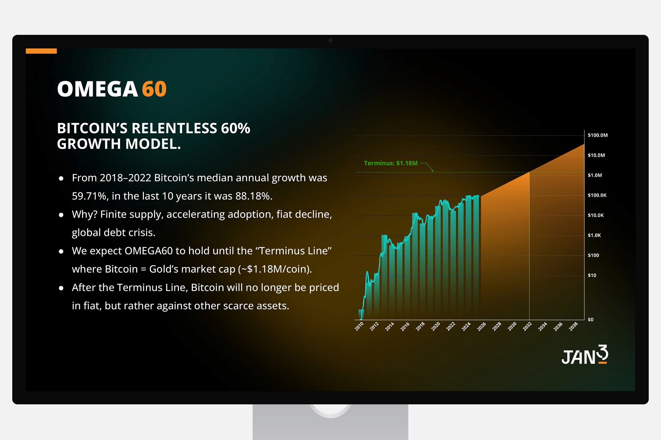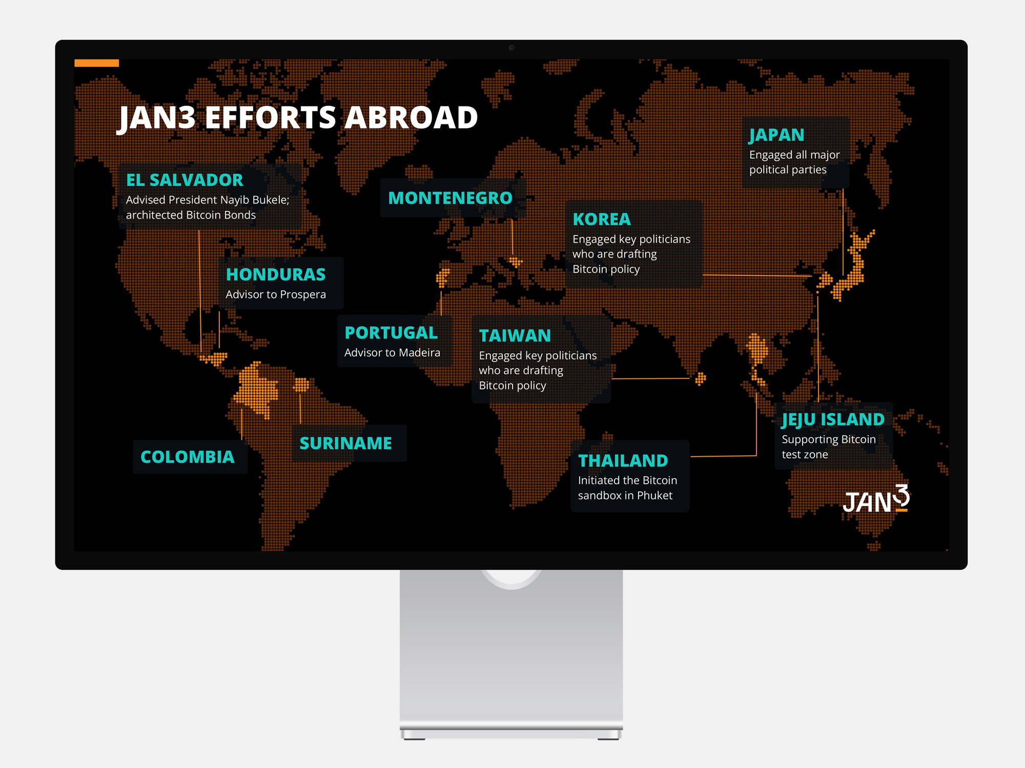 This clean, structured presentation deck positions JAN3 as a Bitcoin-first technology company driving global hyperbitcoinization.