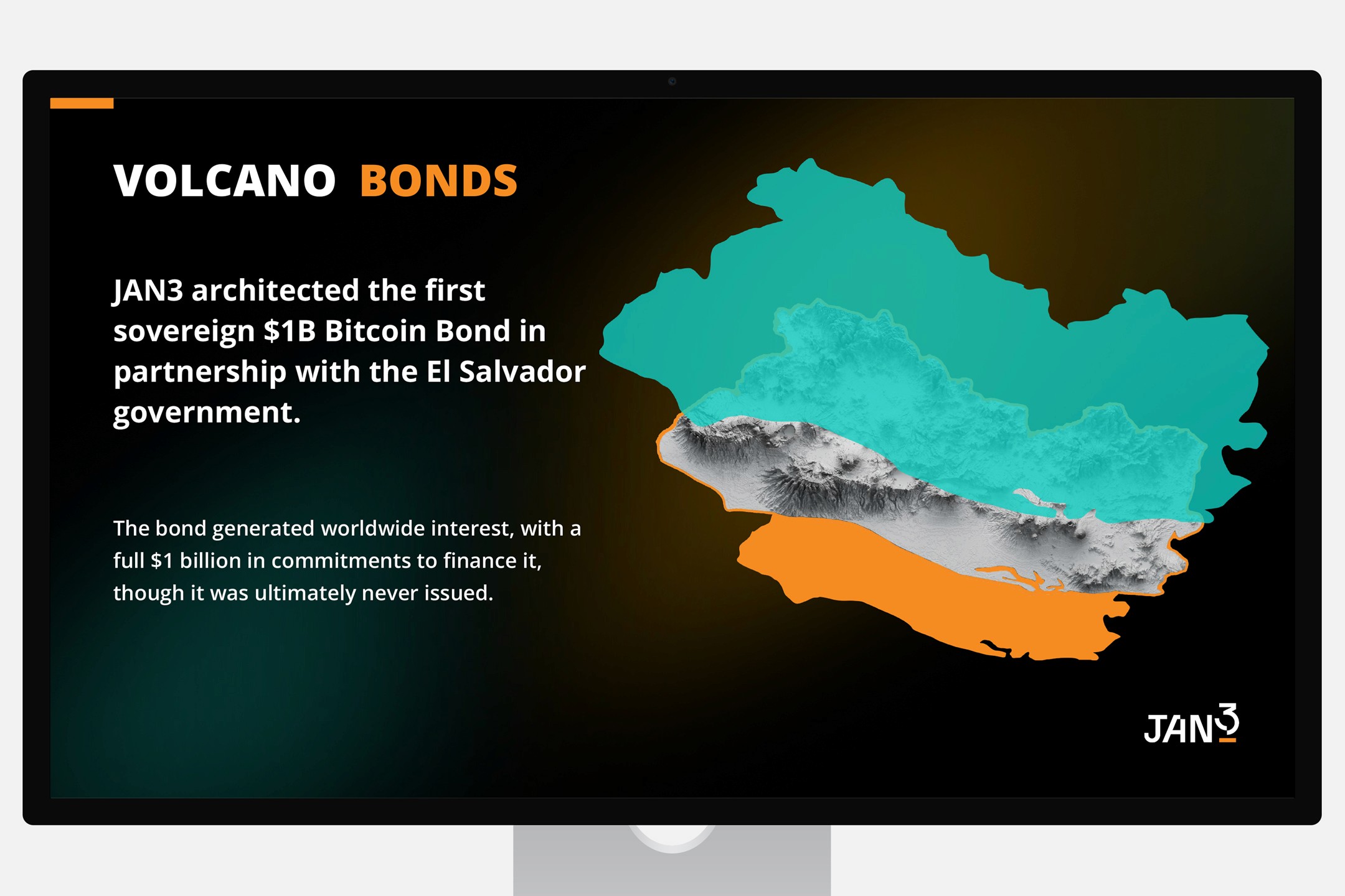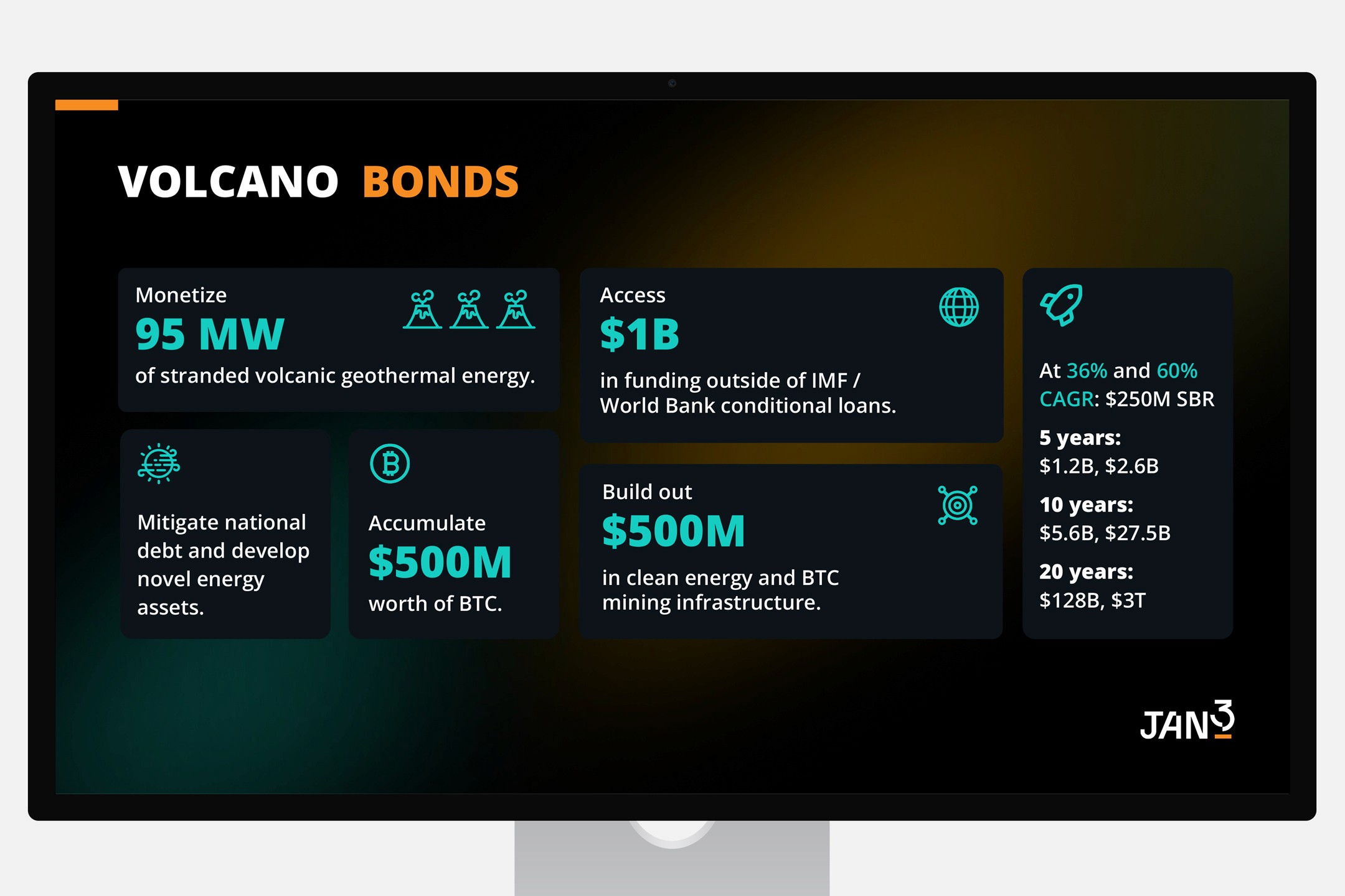 The content needed to move logically from Bitcoin’s core value proposition through cost-of-hesitation arguments, investor return simulations, volcanic/geothermal bond examples, and global outreach efforts, so the design had to enforce strong visual hierarchy, consistent orange accents against dark backgrounds, readable data at large-screen scale, and enough space to make complex financial projections.