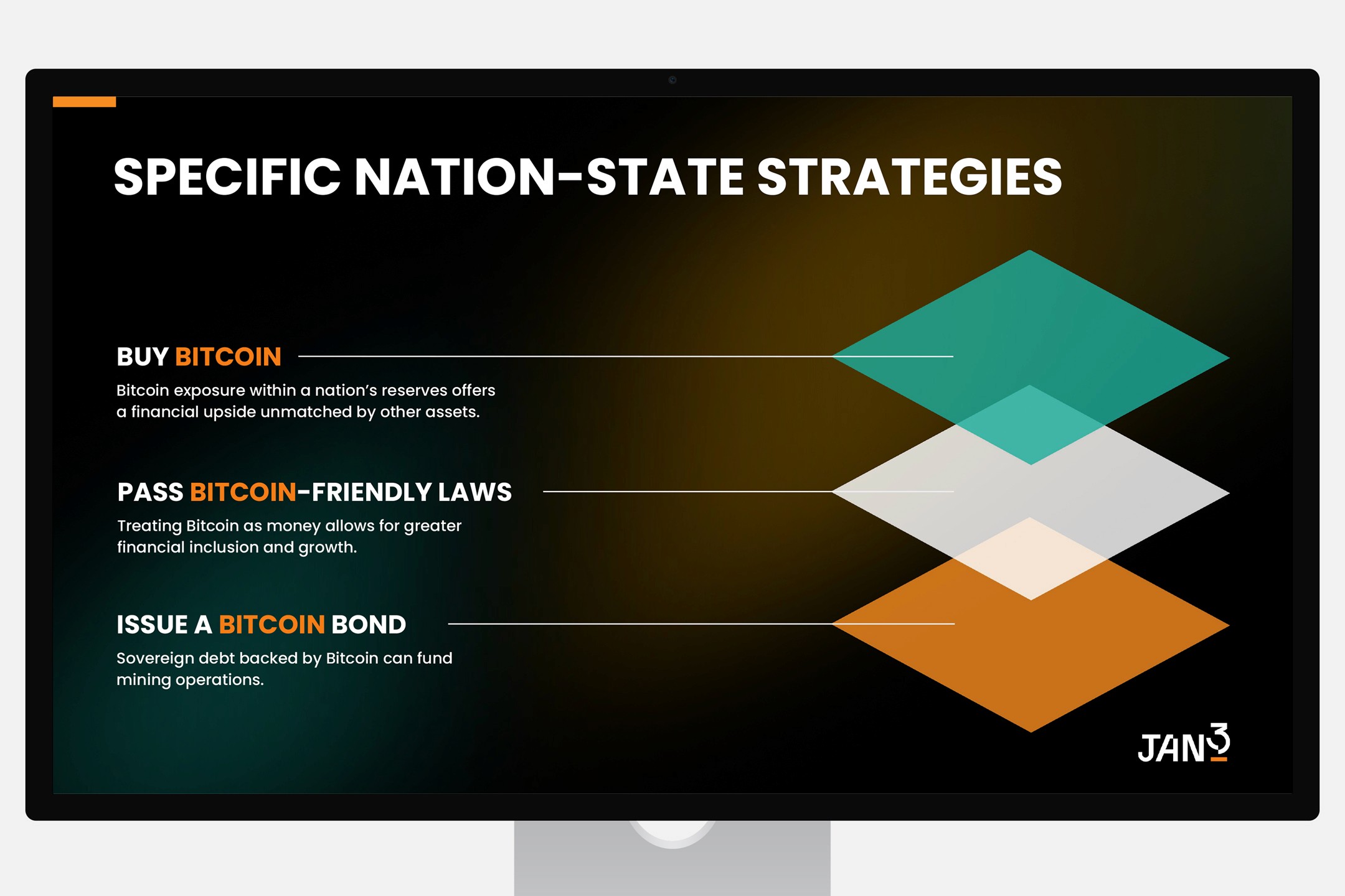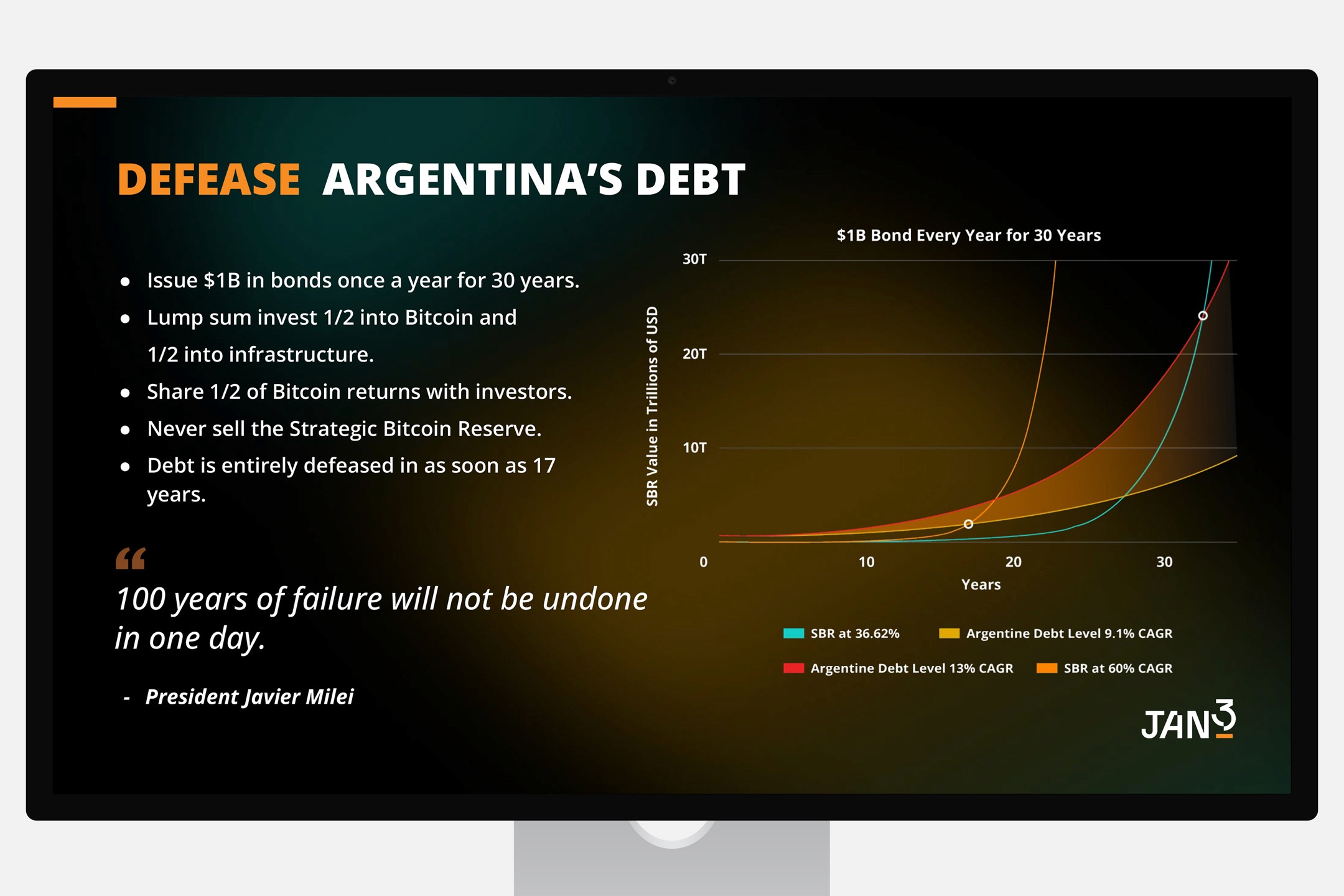 The deck presents a clear, confident vision of JAN3’s role in accelerating sovereign Bitcoin adoption and the transformative power of Bitcoin bonds.