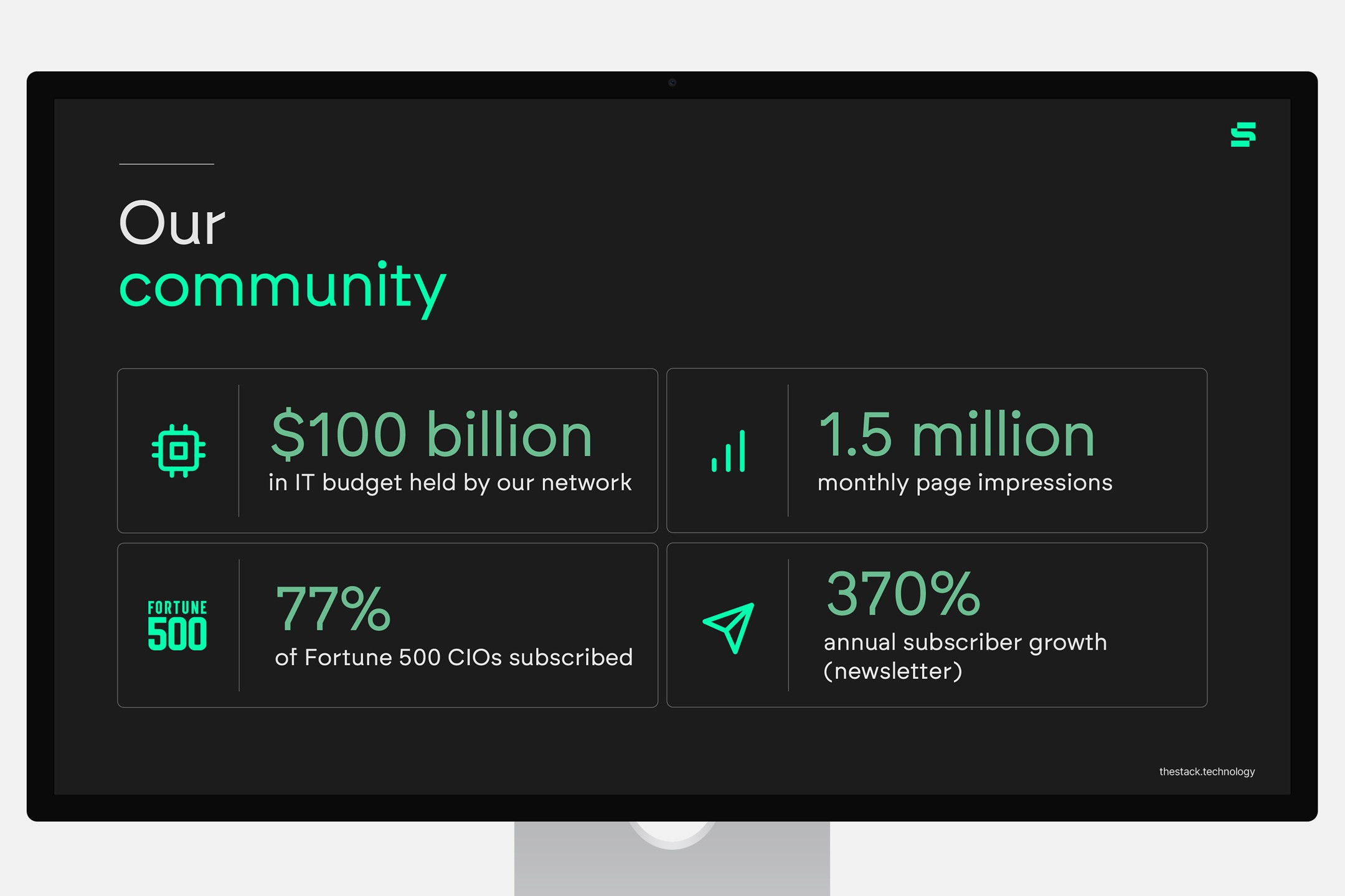 This sharp, high-impact presentation deck positions The Stack as the trusted, class-leading platform for senior IT leaders, showcasing its influential community, powerful reach, editorial authority, exclusive events, and proven process for awareness and education campaigns that deliver brilliant results for technology brands.