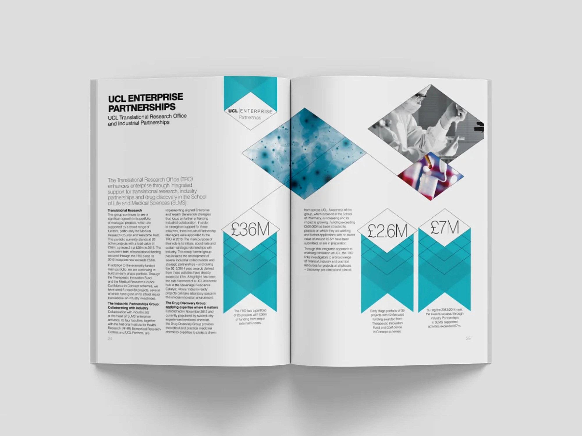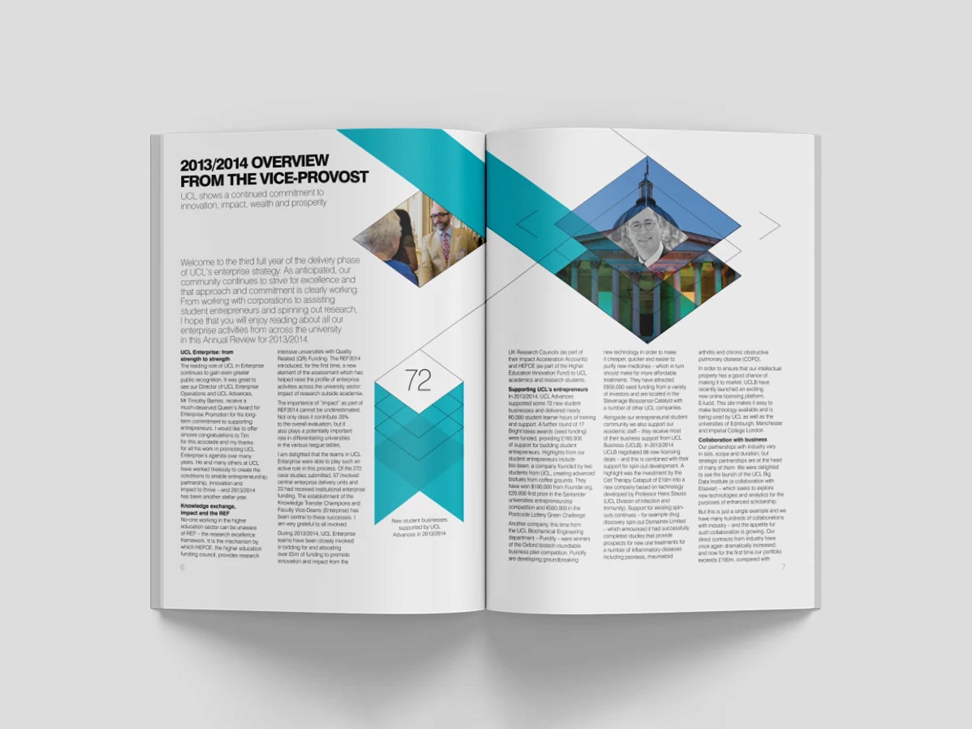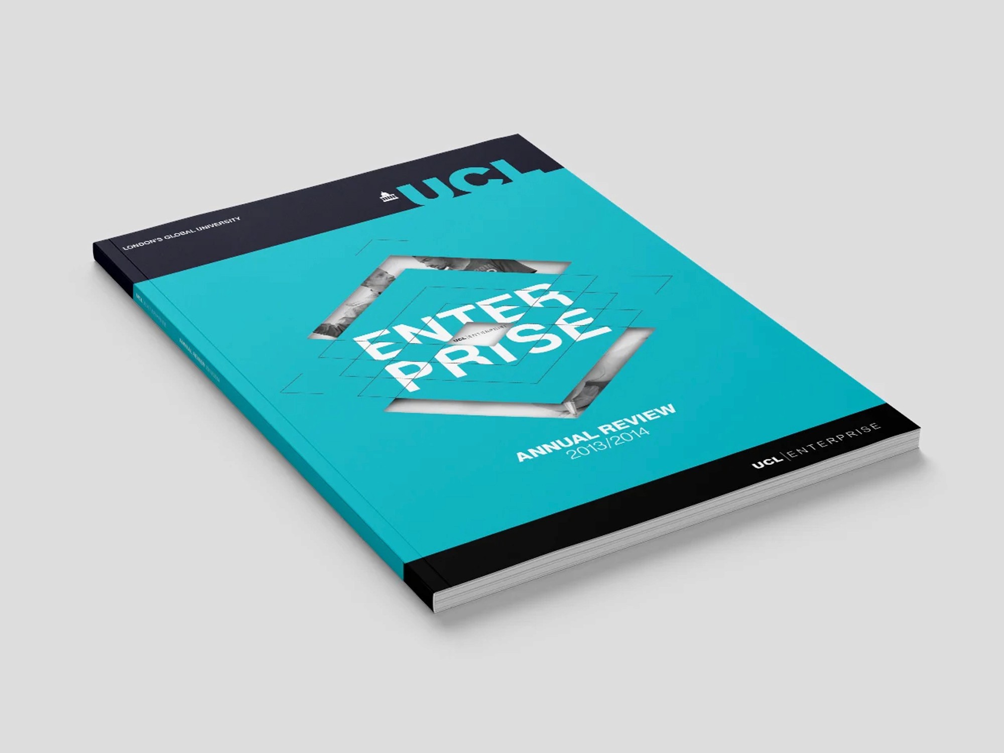 I helped design UCL Enterprise's 2014 Annual Review while working at Navig8, building on their original concept to deliver a clean, professional report with a striking die-cut cover and connecting ribbon motif that beautifully wove the theme of 'connections' throughout the document.