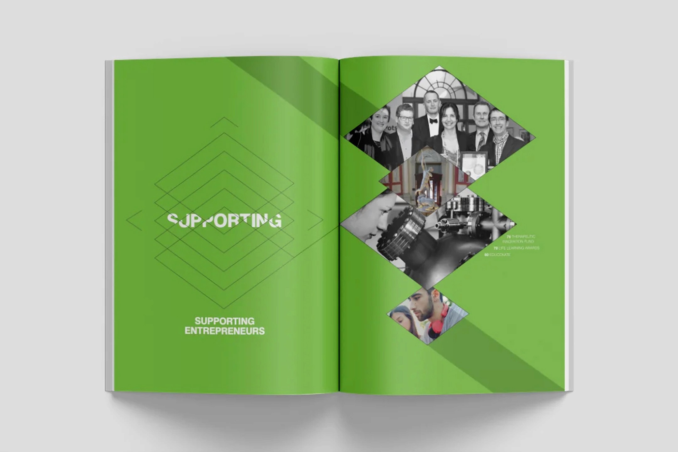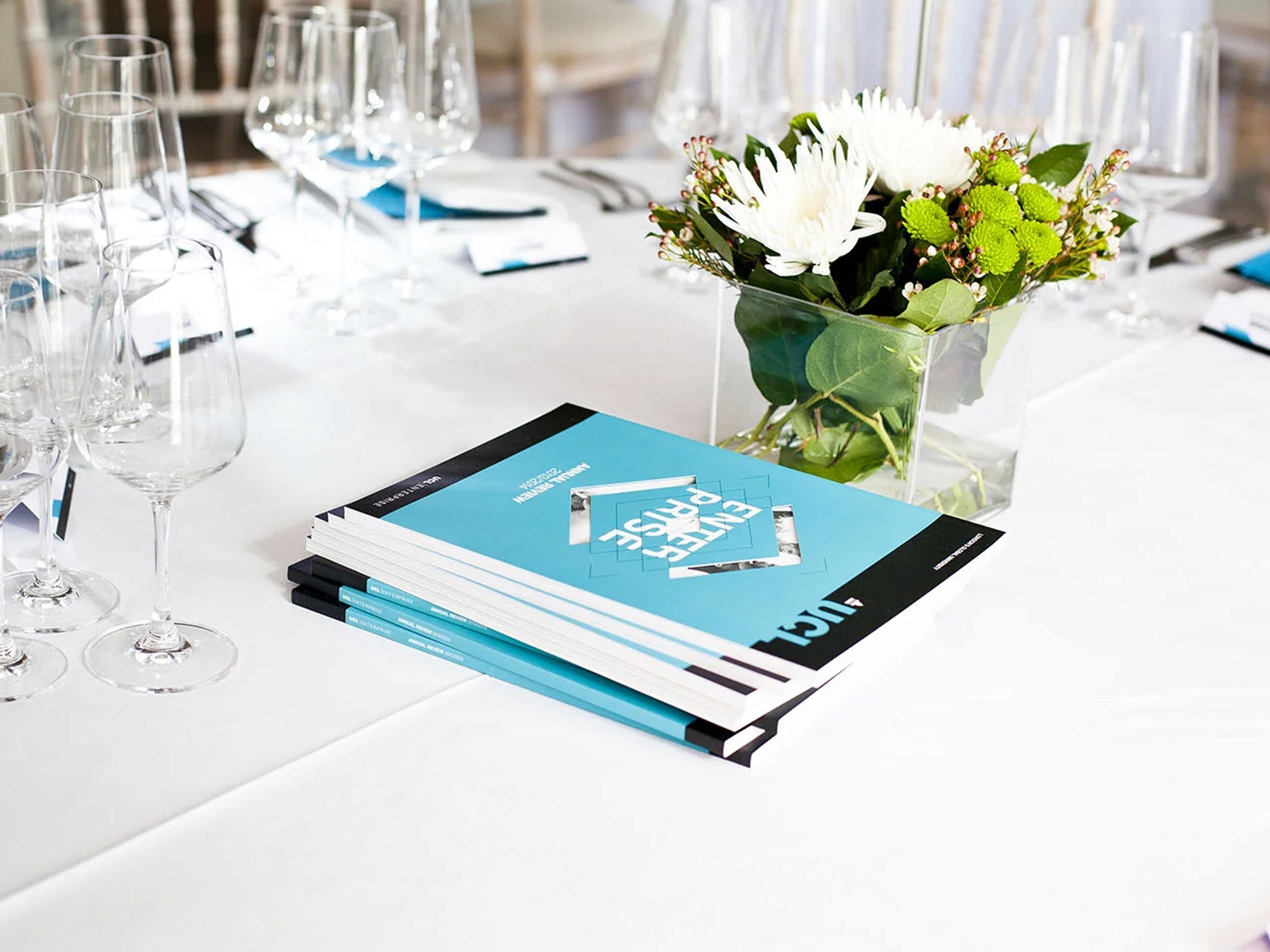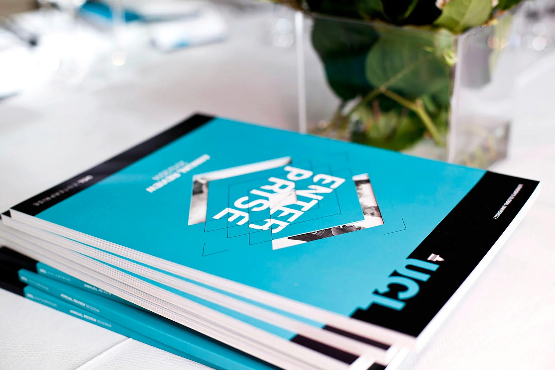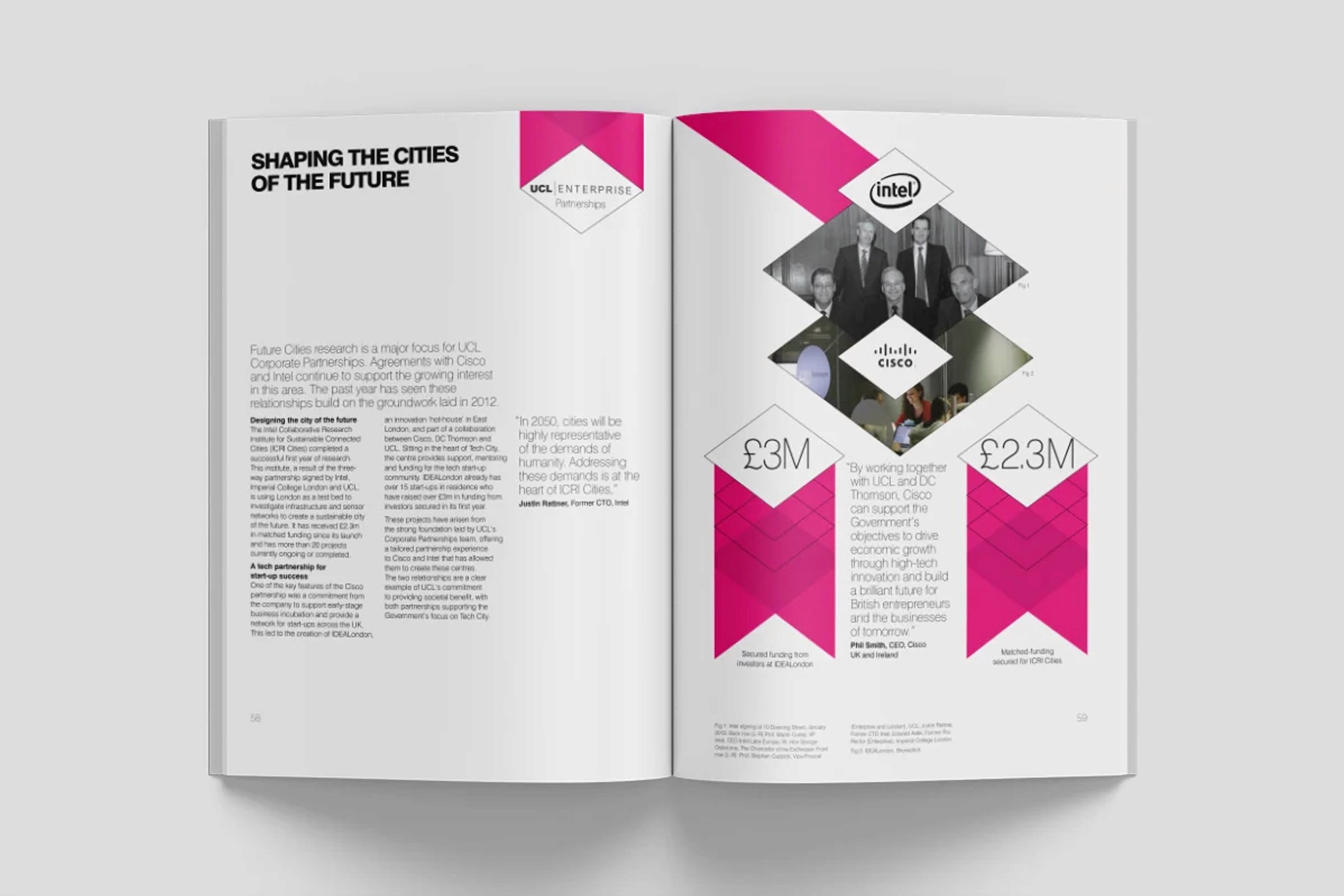 I helped design UCL Enterprise's 2014 Annual Review while working at Navig8, building on their original concept to deliver a clean, professional report with a striking die-cut cover and connecting ribbon motif that beautifully wove the theme of 'connections' throughout the document.