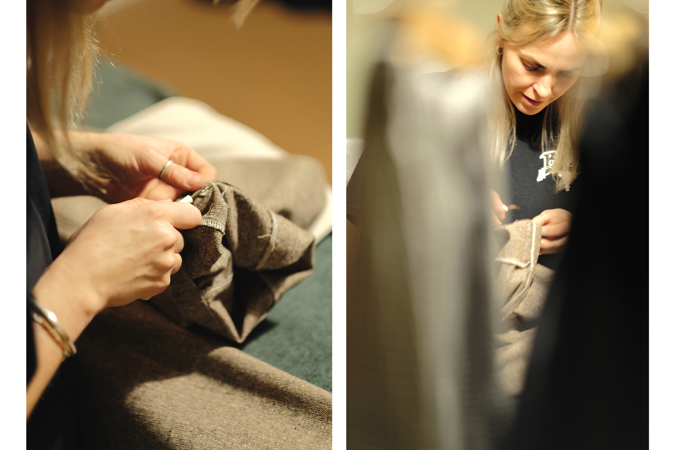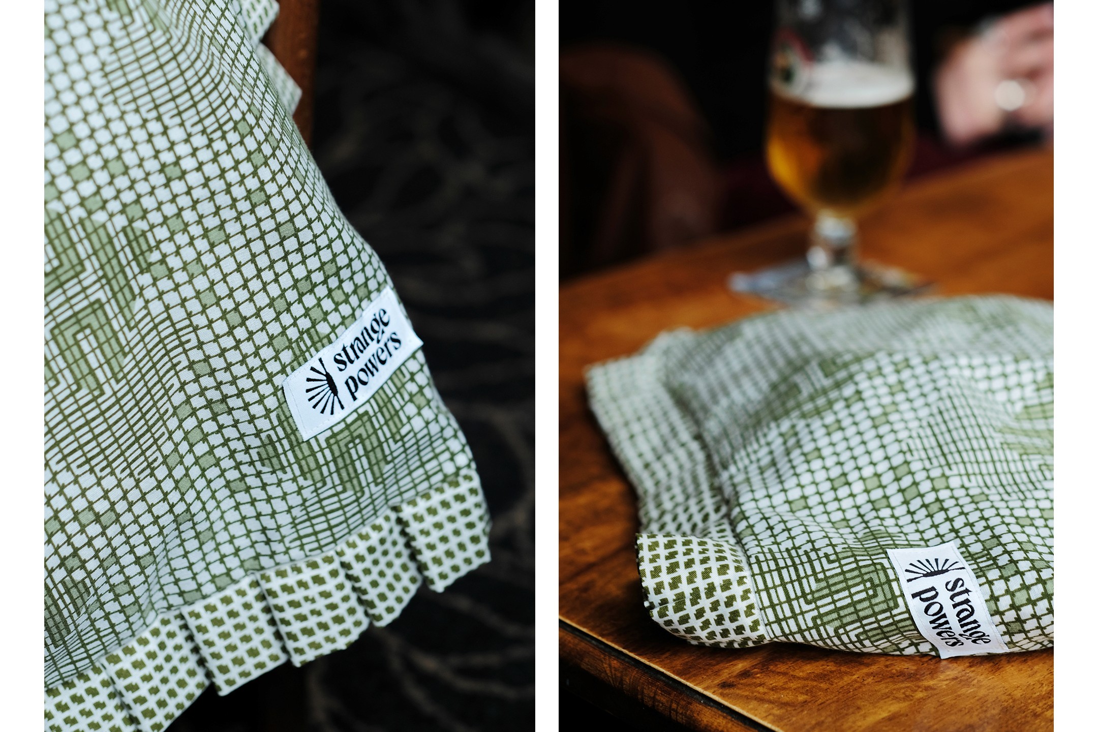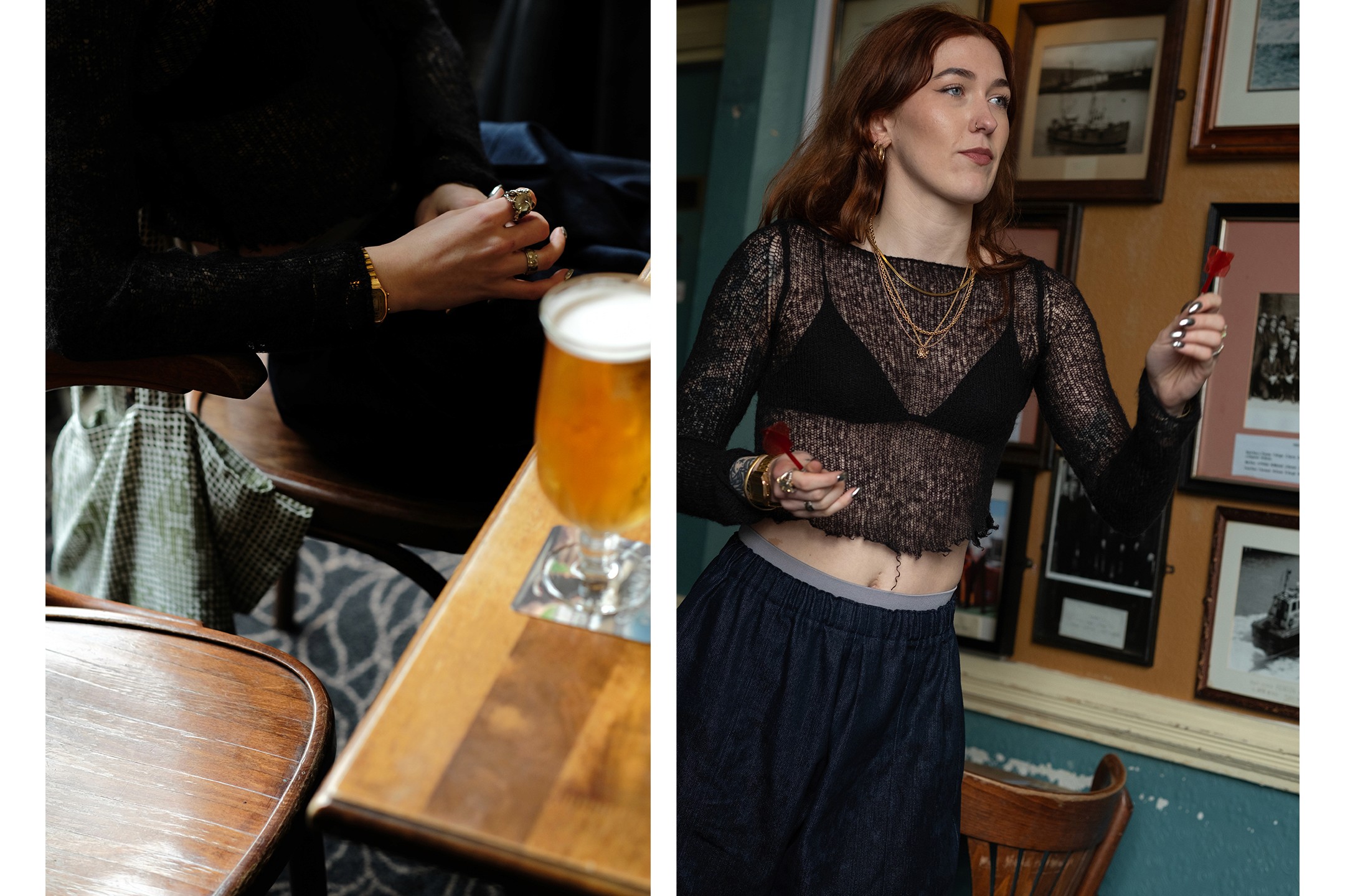 The mix of tungsten lights inside and cool window daylight created beautiful contrast: moody blues from outside, golden warmth within. Ideal for the more structured, textured layers in Strange Powers. Trousers and bags that feel intimate yet commanding. I grabbed close-ups of stitching, fabrics, and candid laughs (the girls had a game of darts and a pint).