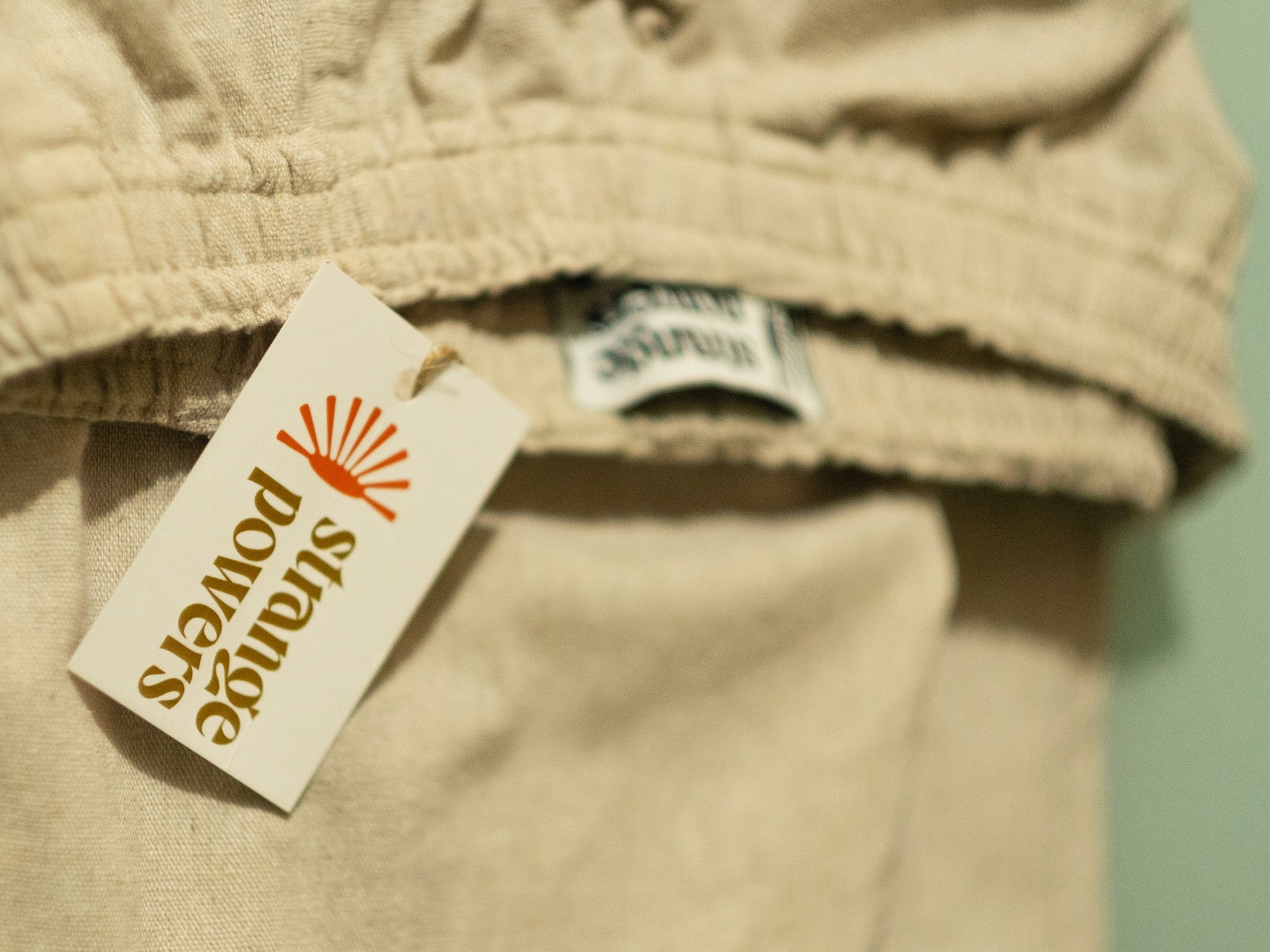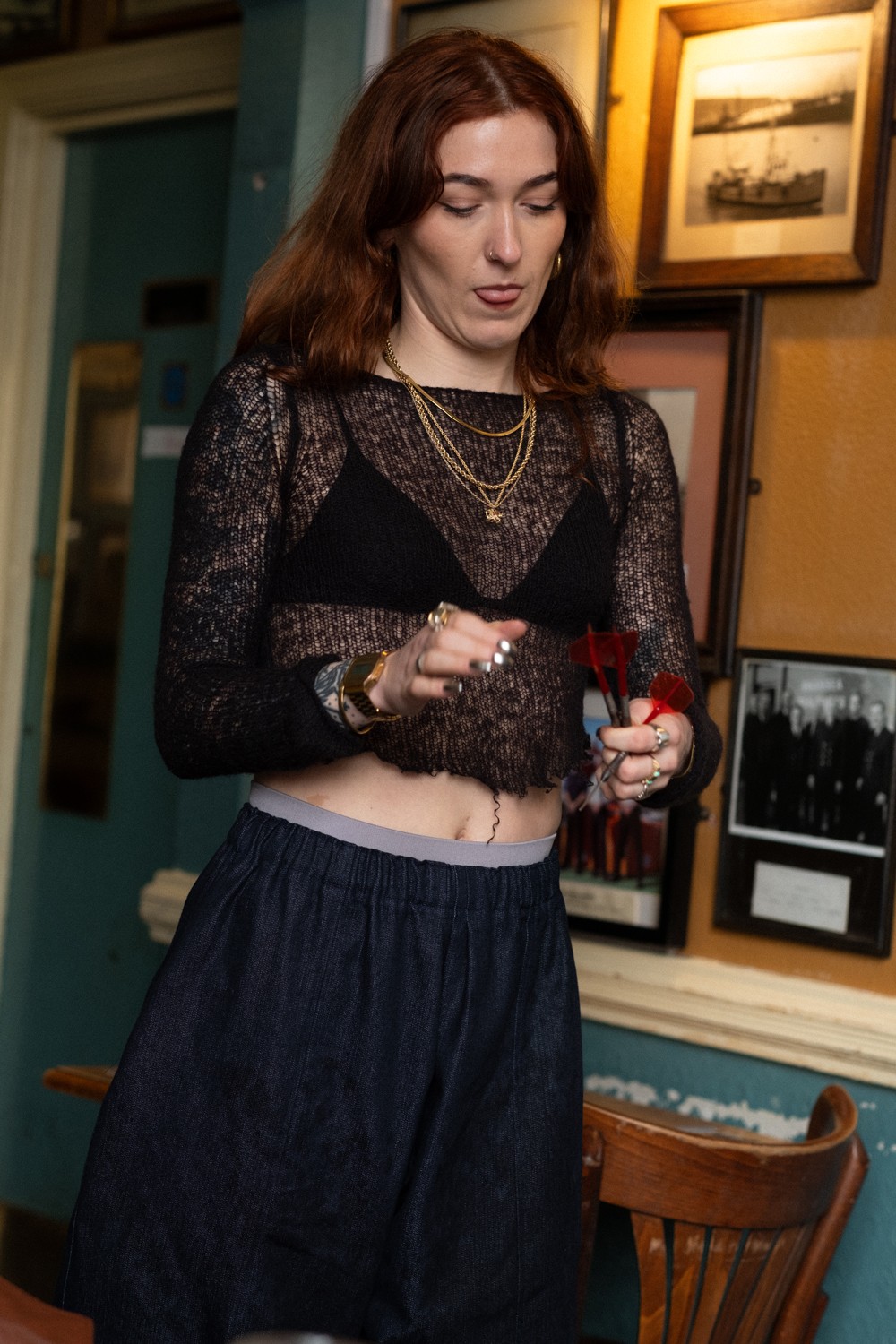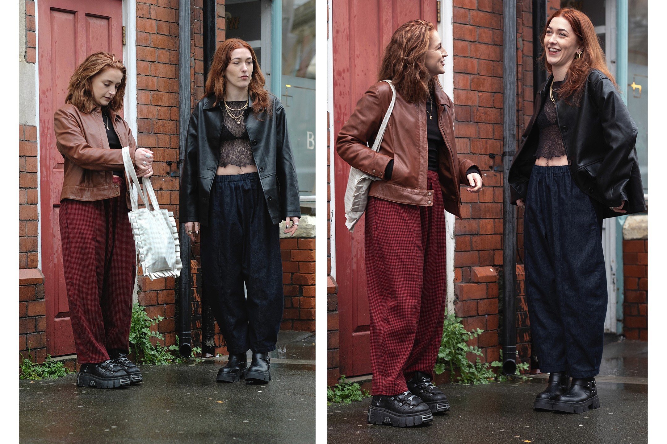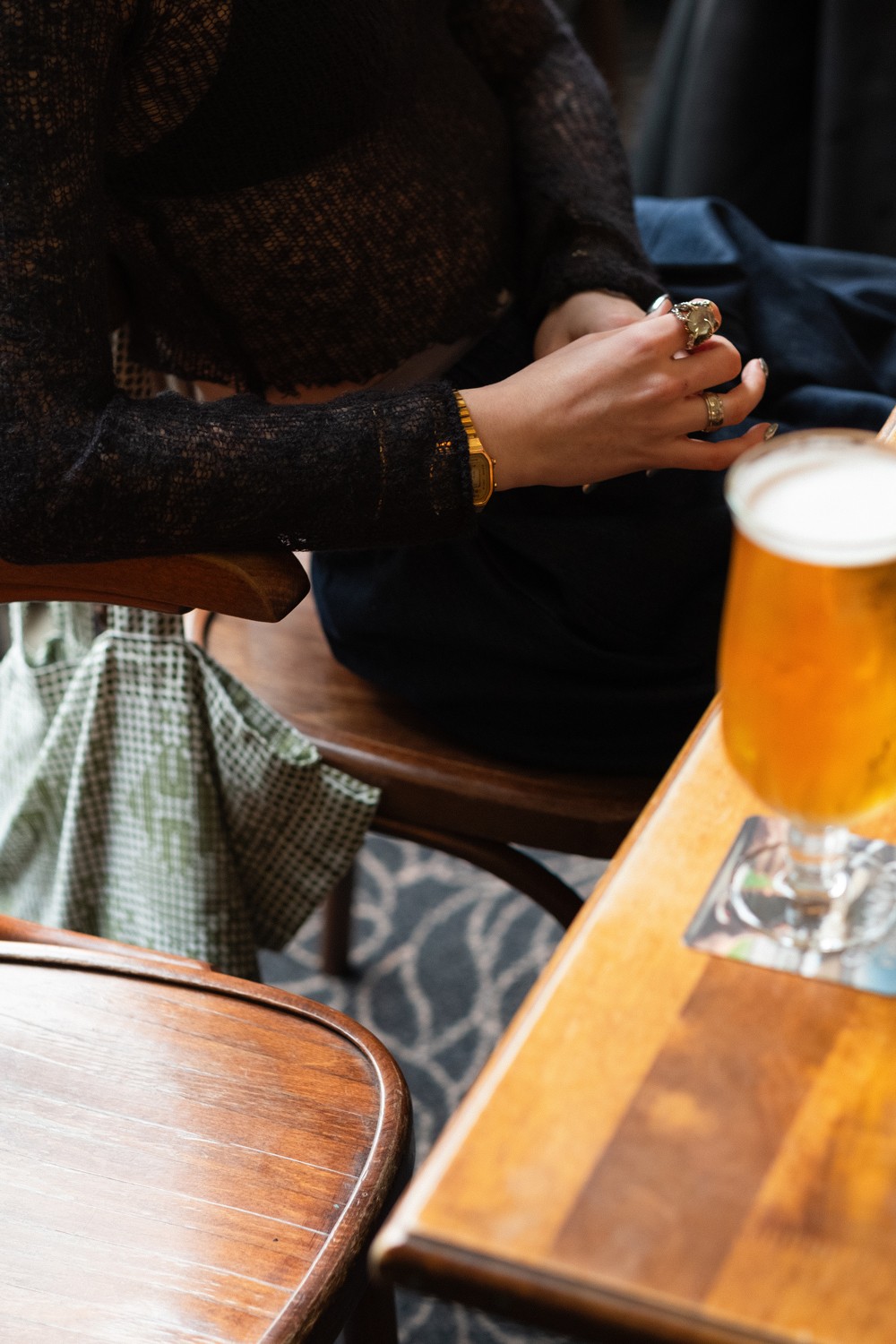 The mix of tungsten lights inside and cool window daylight created beautiful contrast: moody blues from outside, golden warmth within. Ideal for the more structured, textured layers in Strange Powers. Trousers and bags that feel intimate yet commanding. I grabbed close-ups of stitching, fabrics, and candid laughs (the girls had a game of darts and a pint).